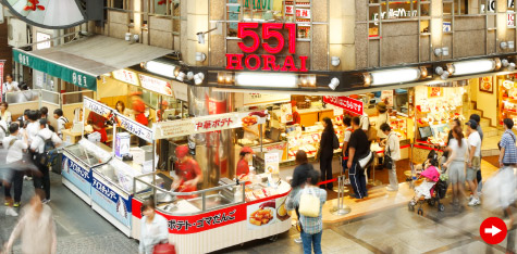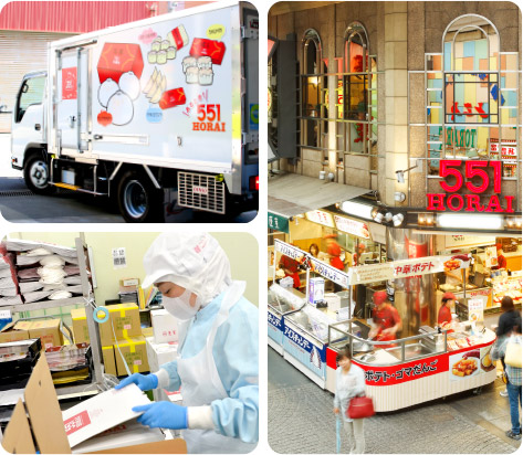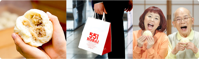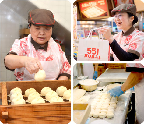 551HORAIのテイクアウト店の特徴は、実演販売にあります。できたてのおいしい商品をみなさまに召し上がっていただくために、店内厨房で豚まんを1個ずつ手包みして蒸しあげます。また、実演販売は毎日行われる劇場公演のようなライブと捉え、感動を味わっていただくことを目標にしています。